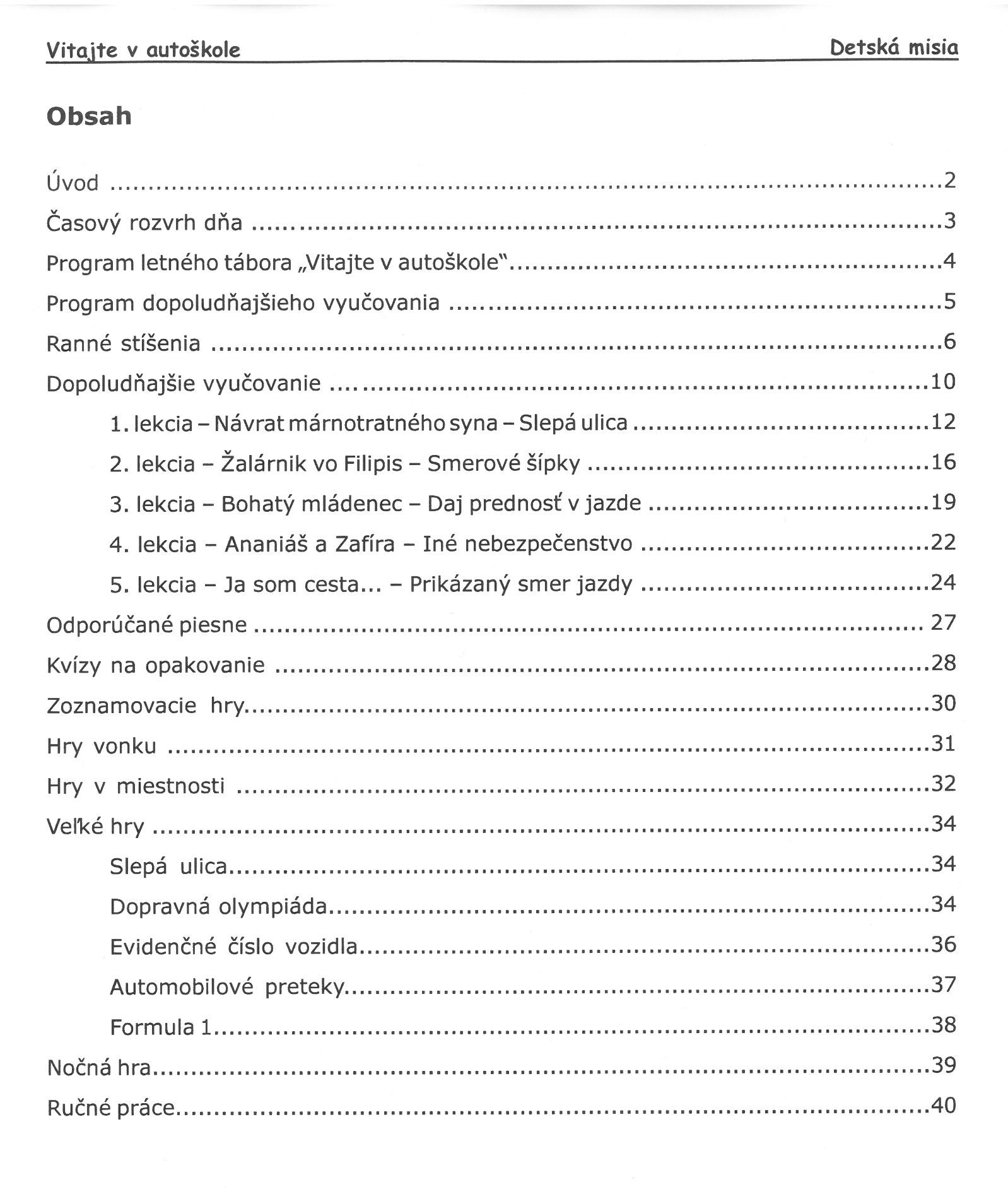 - kompletne vypracovaný táborový program, ktorý obsahuje ranné stíšenia, texty biblických lekcií, nápady na hry, kvízy a ručné práce, vizuálne pomôcky k vyučovaniu veršov na zapamätanie a i.