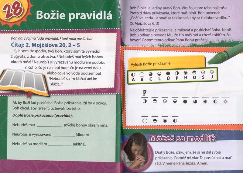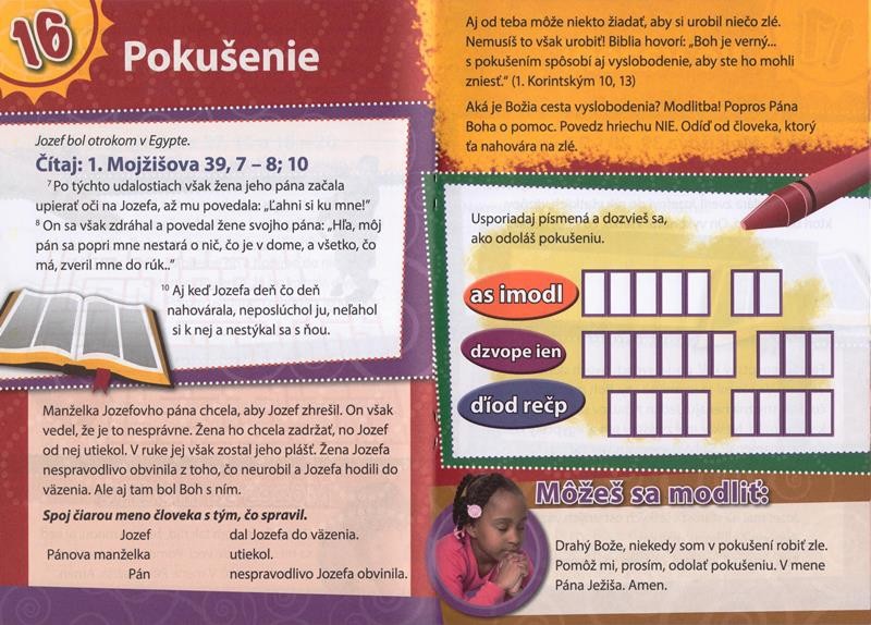 Jedná sa o denné čítanie pre deti vo veku 6 – 8 rokov. Brožúrka obsahuje 30 zamyslení nad Božím slovom a je doplnená množstvom farebných obrázkov, hádaniek a doplňovačiek. Môžete ju študovať spolu s vašimi deťmi a naučiť ich, aké vzácne sú chvíle s Bibliou.