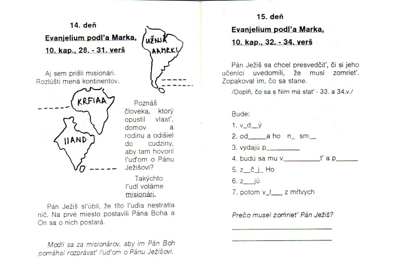 Pomôcka na každodenné stíšenia pre deti vo veku 7 – 10 rokov. Deti si môžu každý deň v priebehu 1 mesiaca čítať pár veršov z evanjelia podľa Marka. K textom sú pripravené jednoduché úlohy na vypracovanie.