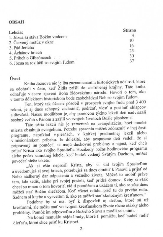 Šesť lekcií hovorí o povolaní Józuu, červenom povraze v okne, prechode cez Jordán, porazení Jericha, Achánovom hriechu a príbehu o Gibeoncoch.