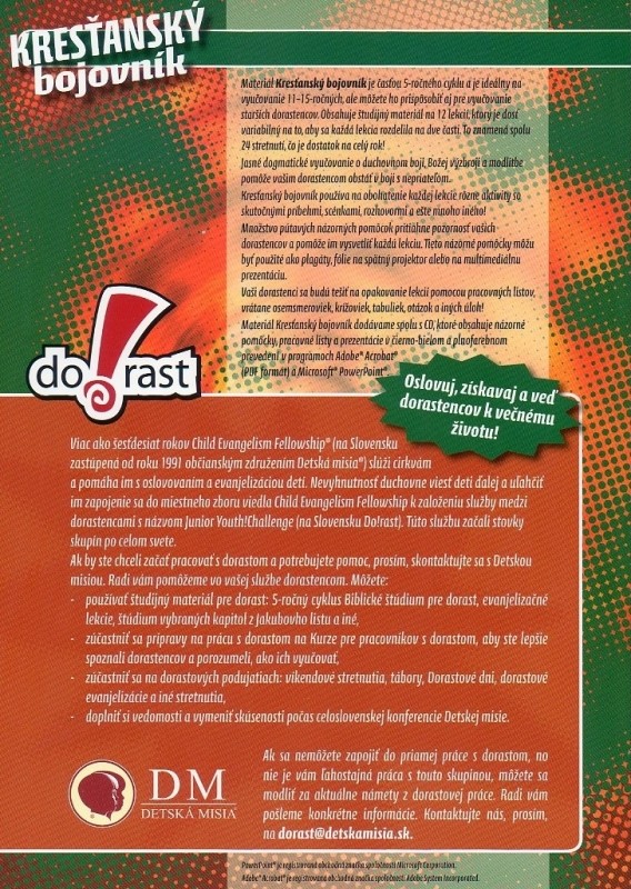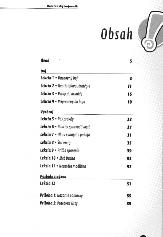 Jasné dogmatické vyučovanie o duchovnom boji, Božej výzbroji a modlitbe pomôže vašim dorastencom obstáť v boji s nepriateľom. Kresťanský bojovník používa na obohatenie každej lekcie rôzne aktivity so skutočnými príbehmi, scénkami, rozhovormi a ešte mnoho iného!